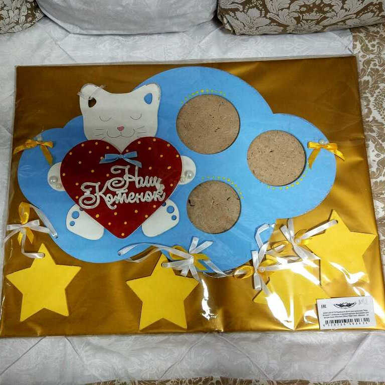 В упаковке идет на блестящей подложке - она рамкой не является. Сама рамка - это голубое облачко с подвесными звездочками.