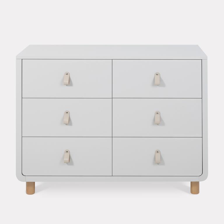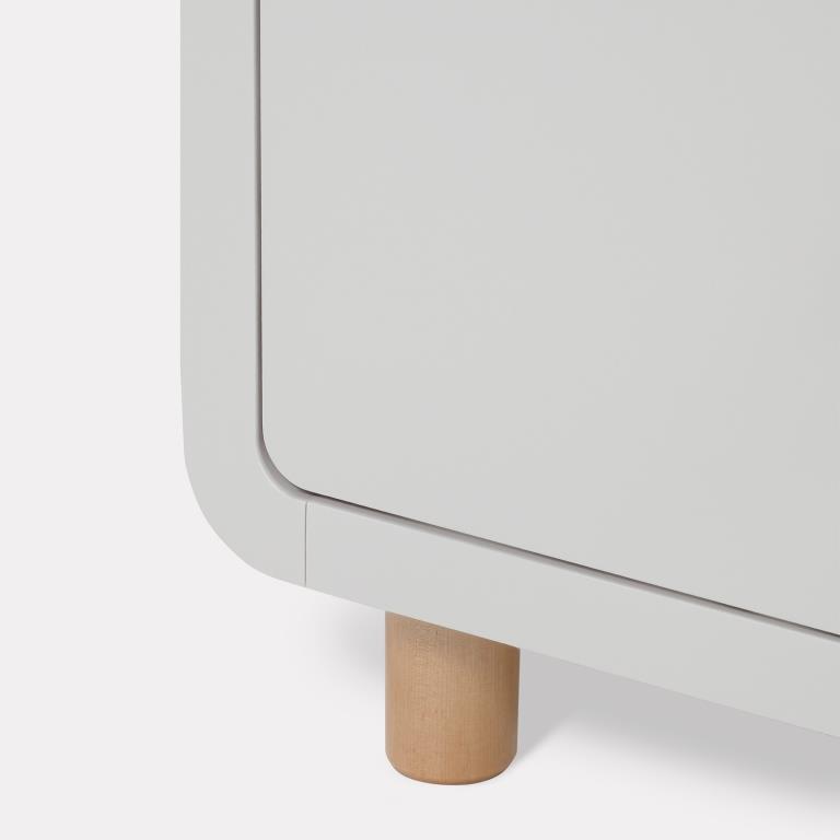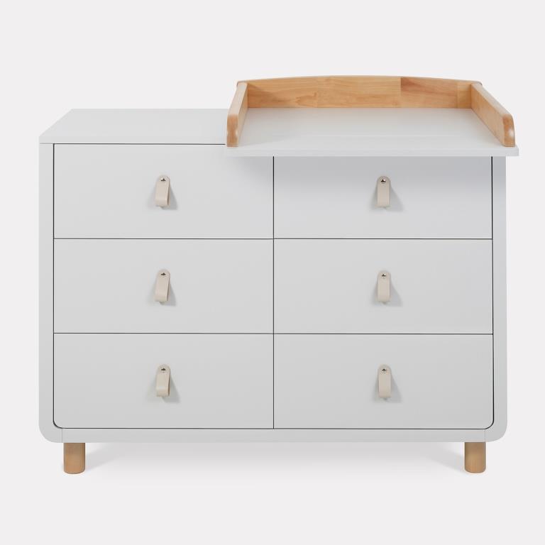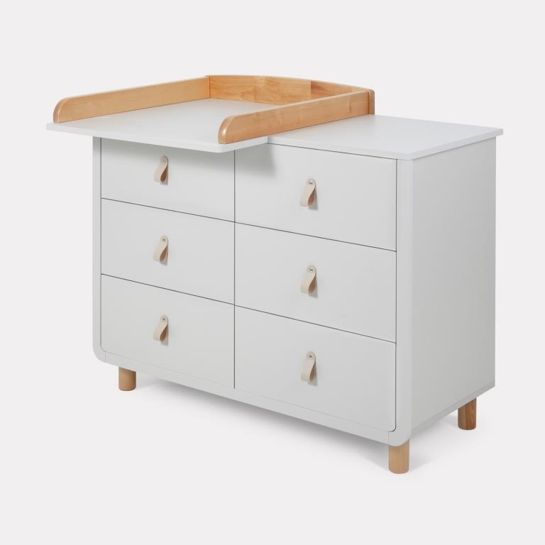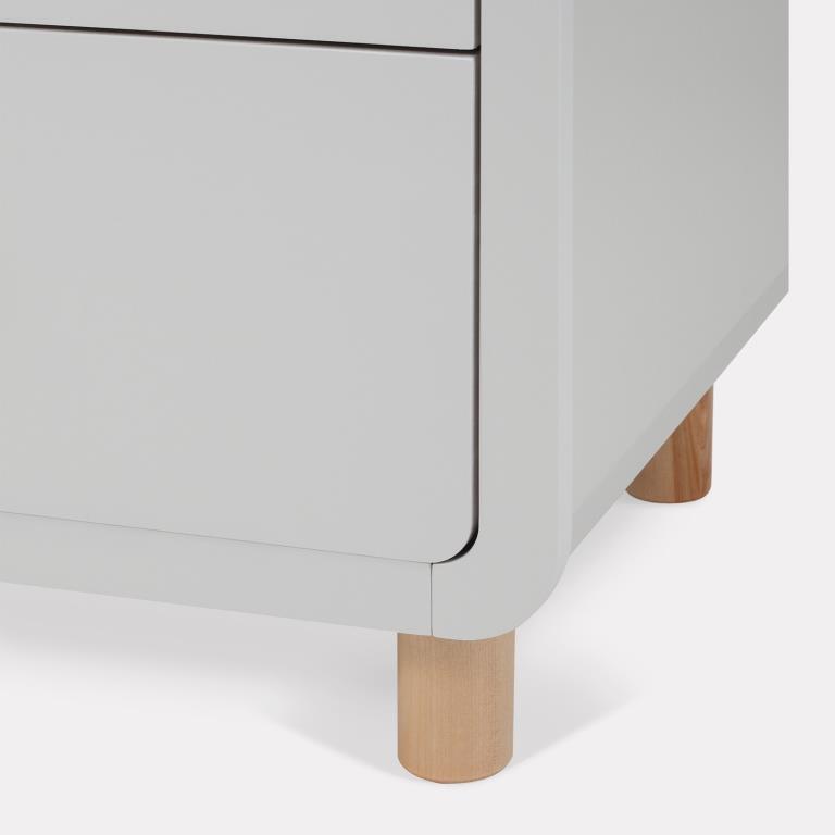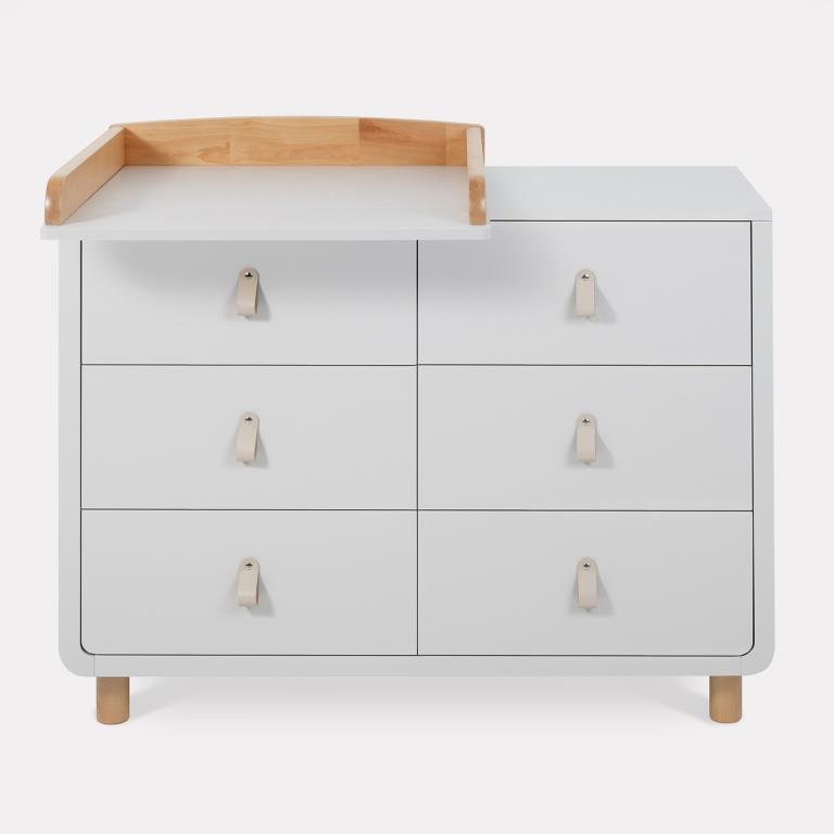 плавные линии бортика не только рифмуются с обтекаемым фасадом комода и ножками в форме цилиндров, но и обеспечивают безопасность (старший ребенок не наткнется на острый угол пеленальной накладки)
