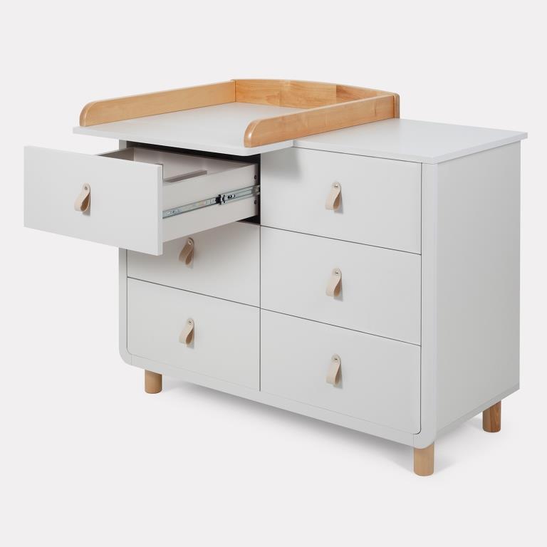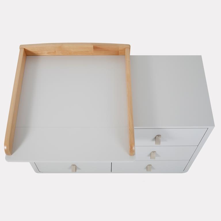 комод дополнен съемным бортиком, превращающим его в полноценный пеленальный столик. Бортик можно установить в двух положениях - слева и справа.