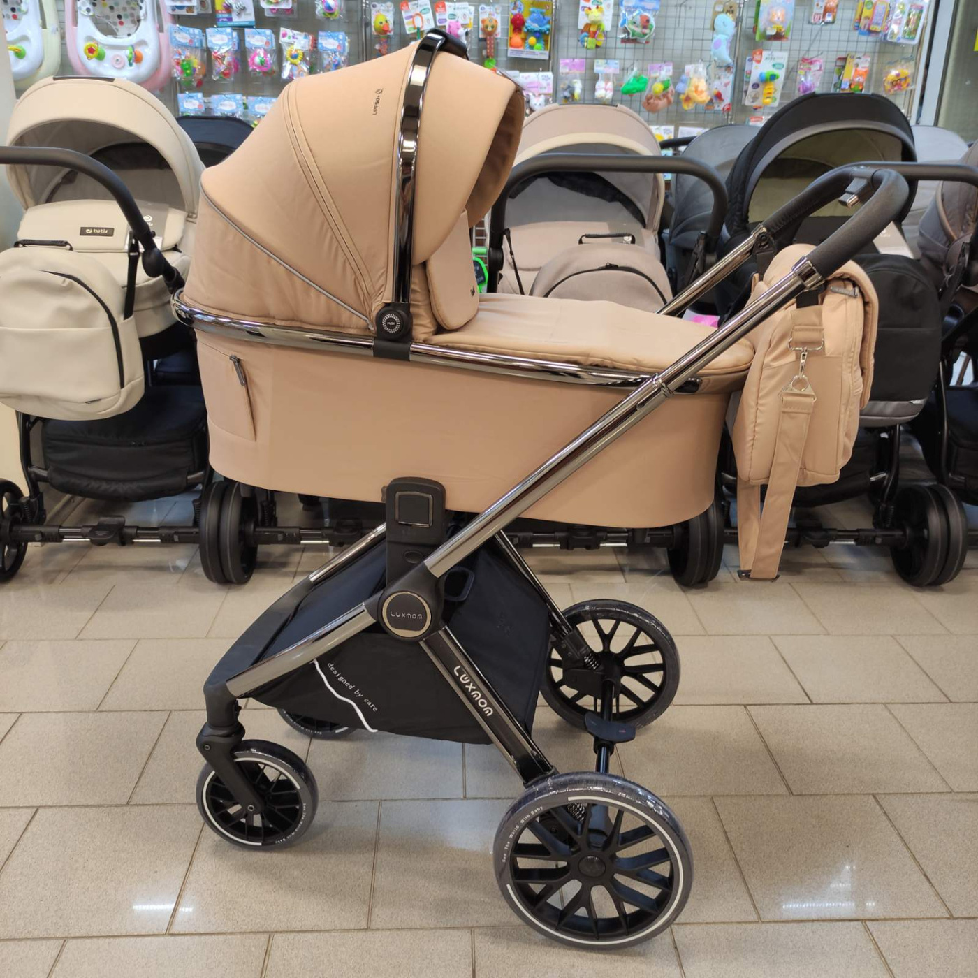Модульная коляска, состоящая из 2-х блоков: лежачего, прогулочного и автолюльки.