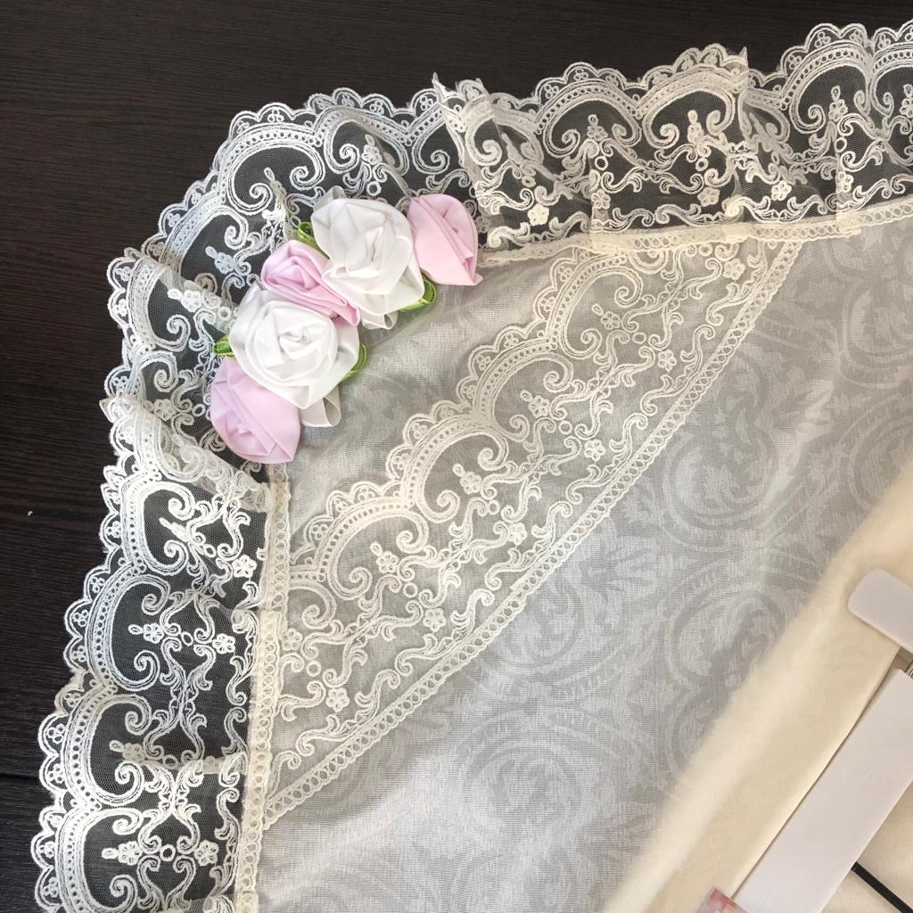 Уголок на выписку, нарядный, украшен кружевом.