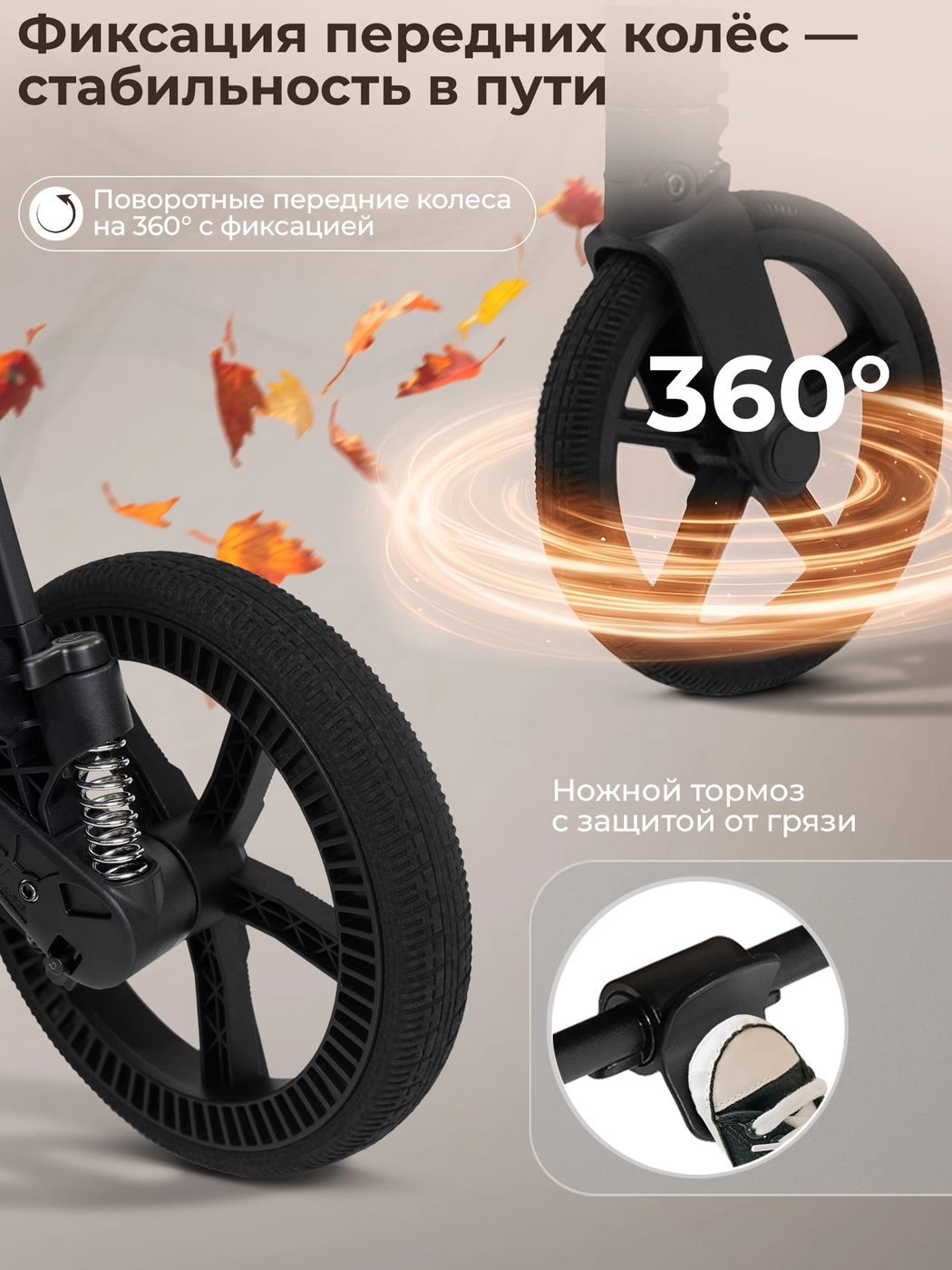 Колеса из высокомолекулярного полимера с регулируемой подвеской обеспечивают мягкую и комфортную прогулку как в городе, так и на природе. Передние колеса поворотные с функцией фиксации.