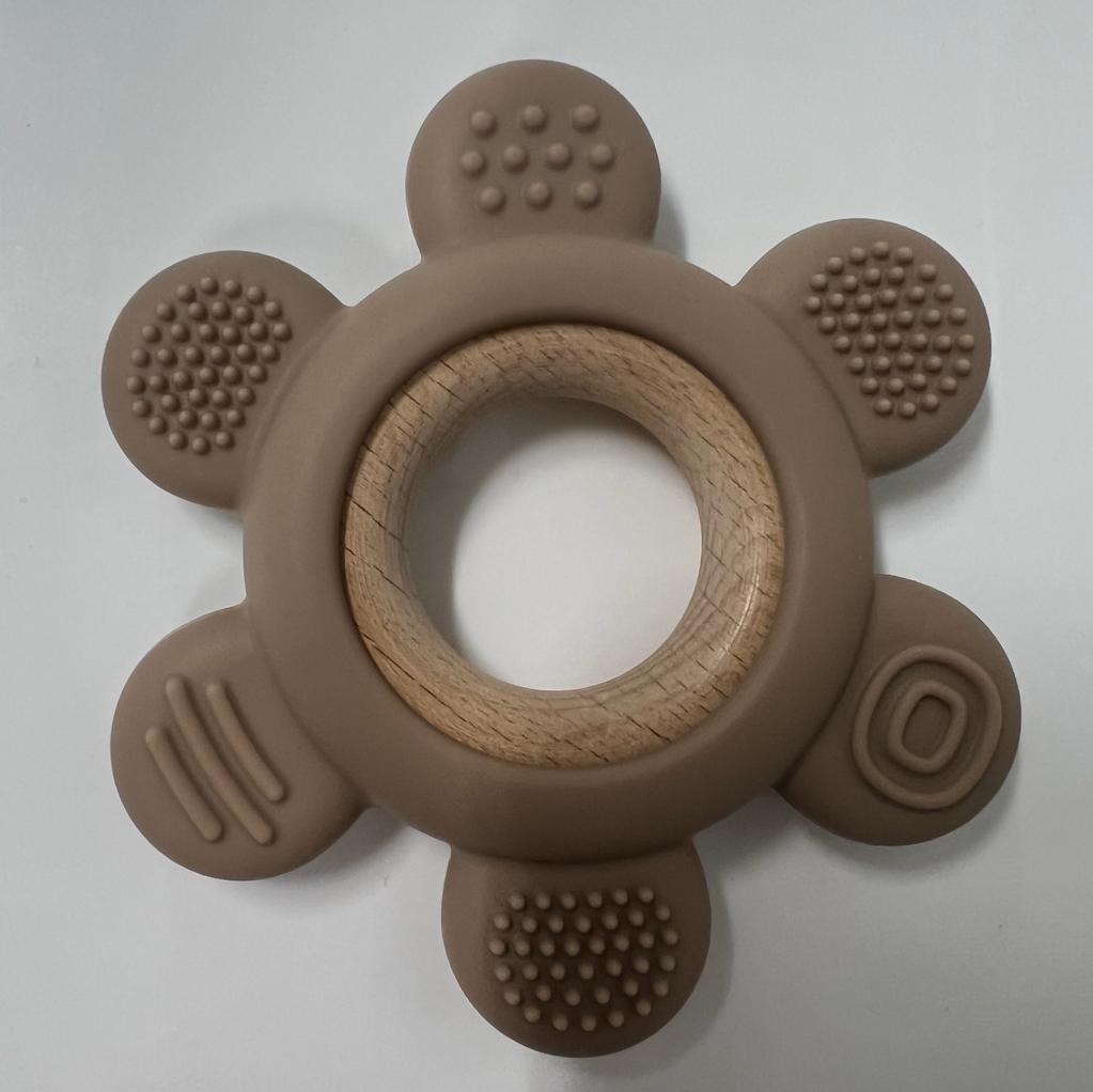 Силиконовый грызунок прорезыватель с деревянным колечком. Деревянное кольцо вынимается для самостоятельной игры или ухода за игрушкой.